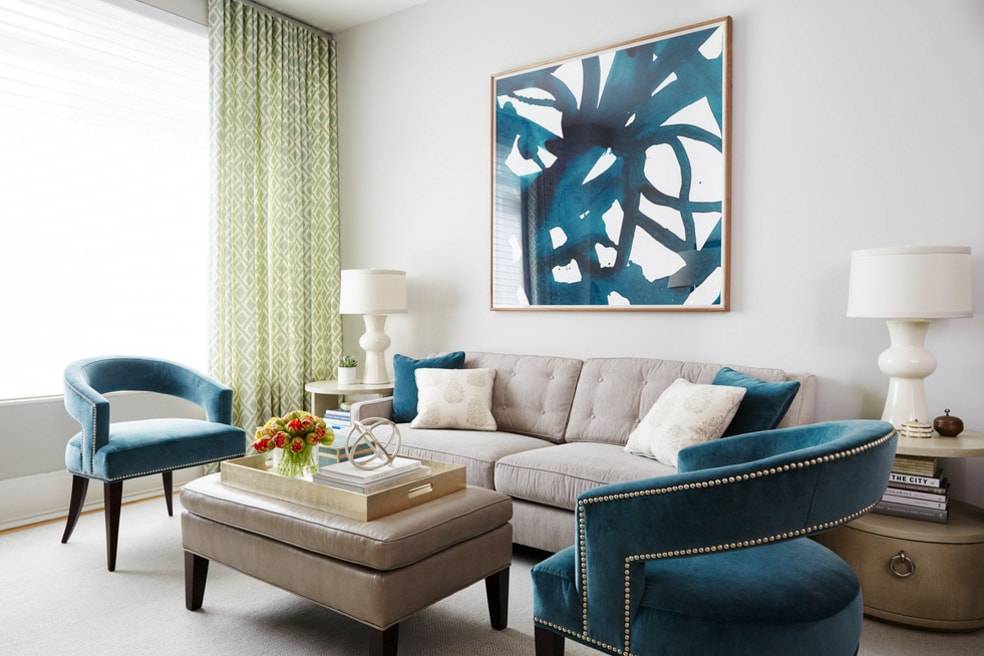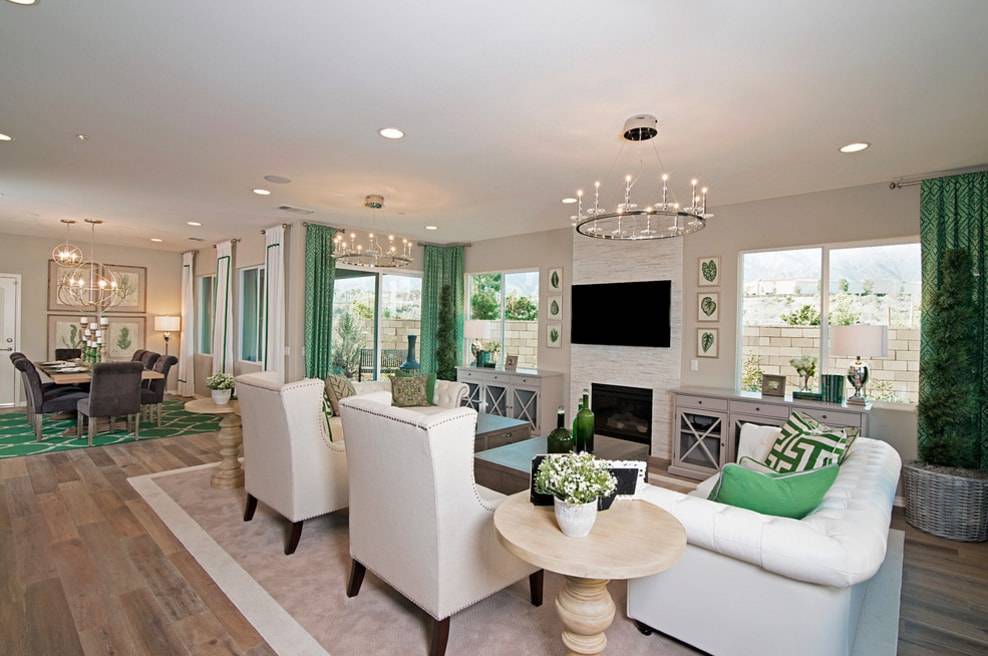Гостиная — место отдыха, работы, общения и развлечений. Здесь человек, при стандартной планировке квартиры, проводит большую часть своей жизни, занимаясь важными (и не очень) повседневными делами. Поэтому тонизирующий, но в то же время умиротворяющий зеленый во всех его вариациях идеально впишется в такую комнату.