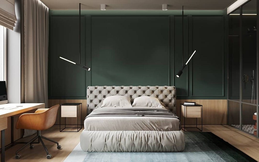 Старайтесь избегать насыщенных оттенков — они, как уже упоминалось, могут препятствовать полному расслаблению. Внедряя зеленый цвет в интерьер спальни, лучше отталкиваться от природной палитры, создавая естественную, легкую атмосферу.