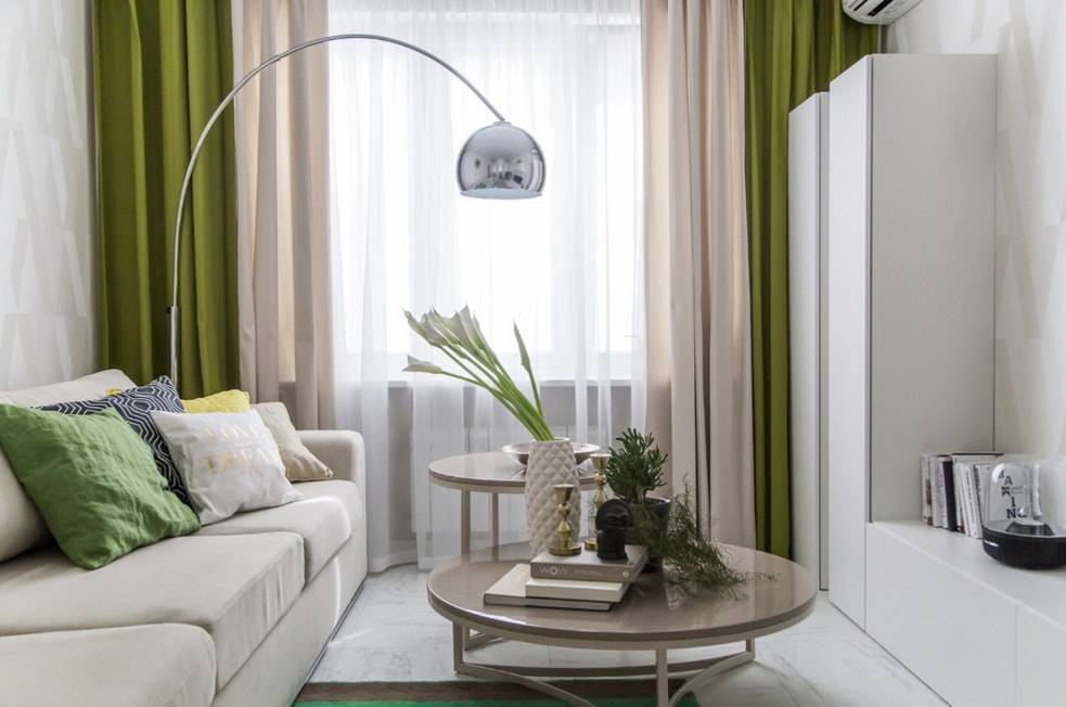 Если гостиная маленьких размеров, то постарайтесь избегать слишком темных оттенков штор. Намного лучше будут смотреться бело-зеленые изделия, которые зрительно увеличат пространство и сделают его более светлым.