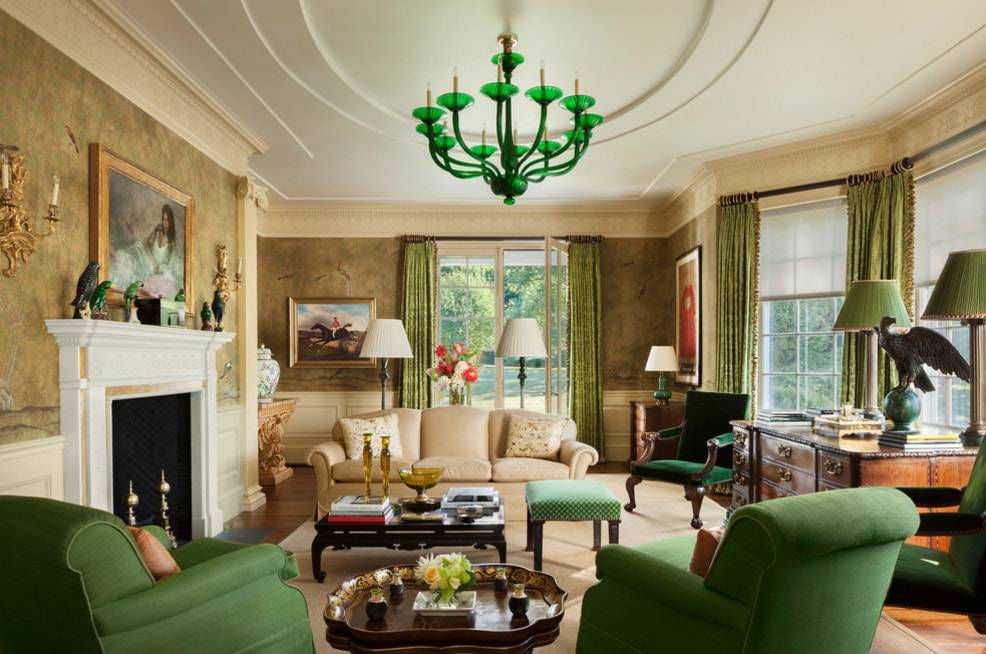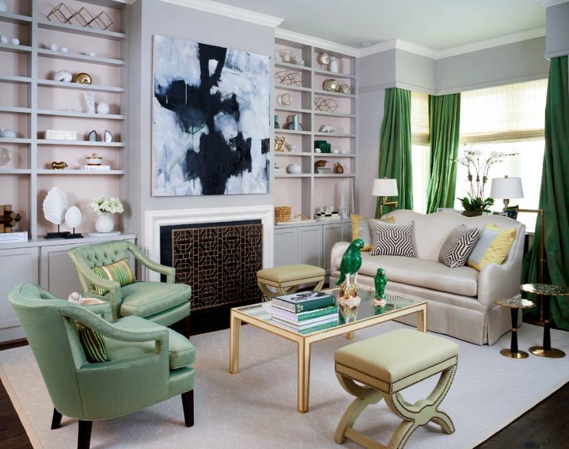 Тем, кому по душе зеленый цвет, можно и вовсе комбинировать в интерьере несколько оттенков. Светлый подойдет для покрытия стен, а шторы в таком случае могут быть ярче. При правильном сочетании оттенков гостиная будет смотреться очень стильно.