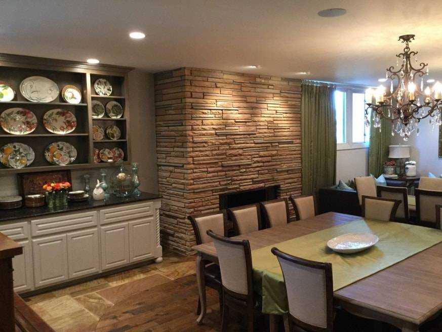 - Довольно пестрый рисунок прекрасно сочетается с деревом, камнем, стилизованными под них современными материалами. Это можно использовать не только в стандартном помещении, но и лофте, студии.