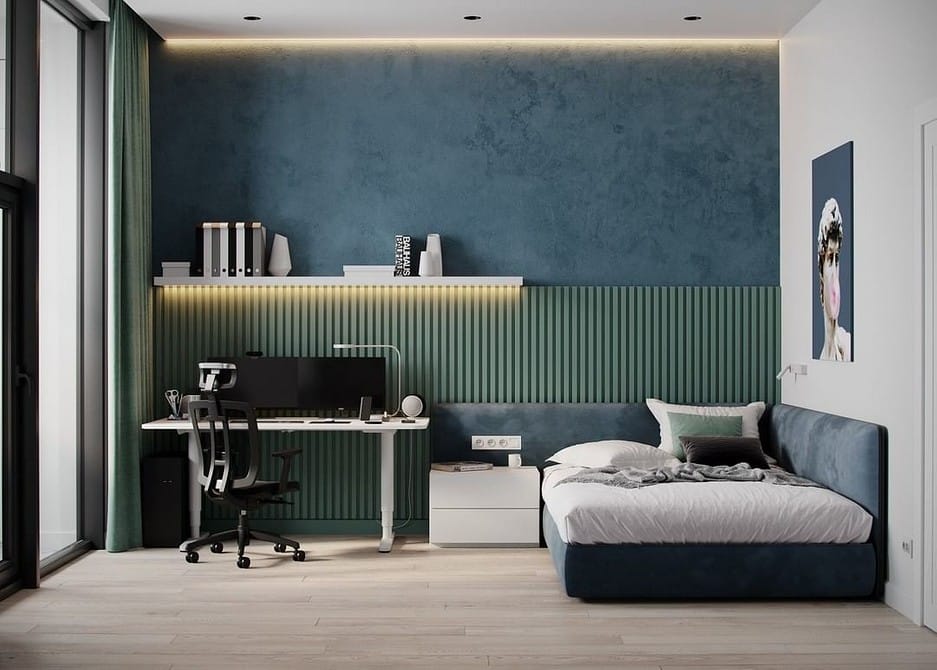 Если вы хотите взять зеленый для отделки, выбирайте пастельную гамму или более холодные разновидности — например, мятный и бирюзовый. Также можно «покрасить» только одну стену, сбалансировав ее белыми перегородками.