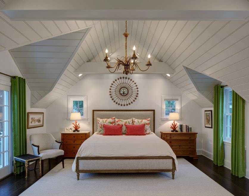 Зачастую для дизайна спальни выбирают светлые оттенки, которые расслабляют и дают ощущение защищенности. Но это вовсе не значит, что в таких комнатах нельзя использовать яркие цвета. Небольшой акцент в виде штор зеленых штор напротив сделает спальню еще более уютной и стильной.
