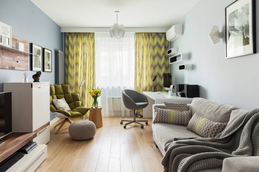 Комбинация серого и зеленого цветов также смотрится весьма красиво. Наиболее часто такое сочетание выбирают любители строгого стиля. В то же время яркие шторы делают интерьер более сбалансированным.