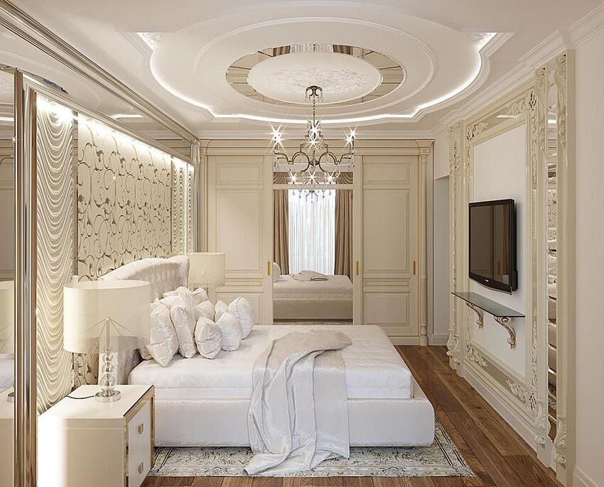 Выбор последнего варианта довольно удачен в условиях однотонных бежевых спален, так как с его помощью можно устранить имеющиеся недостатки поверхностей при помощи оформления многоуровневого дизайна. Таким образом происходит разграничение зон в просторных комнатах.