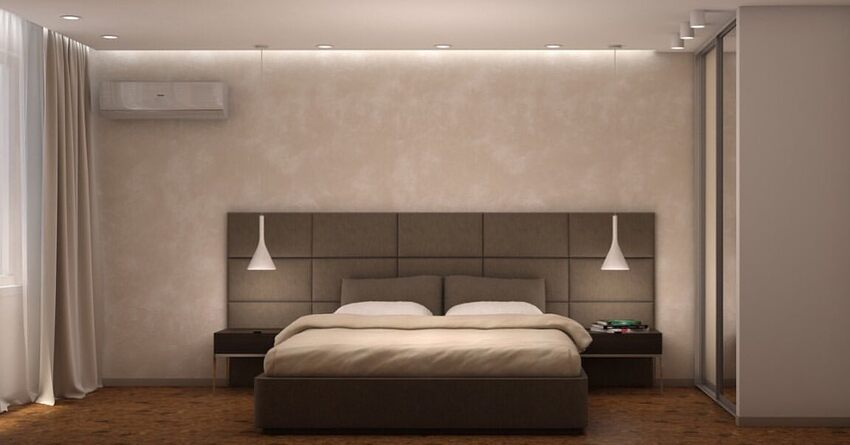 При оформлении спальни в бежевом цвете важно ориентироваться на то, чтобы стены, пол и потолок не сливались друг с другом. Для этого при отделке используются плавные переходы, препятствующие визуальной монотонности и превращению комнаты в единое пространство