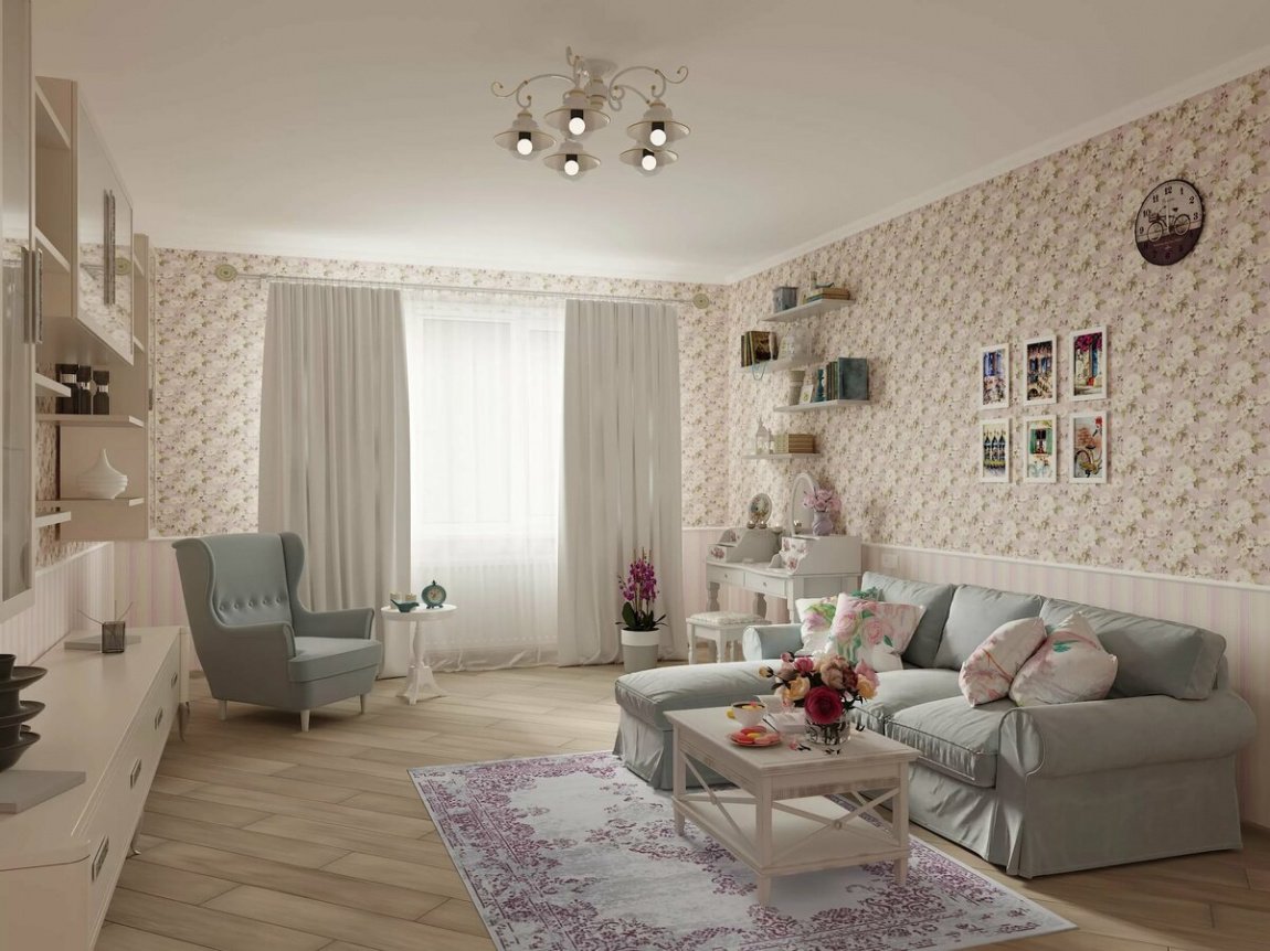 Прованский дизайн гостиной переносит во французскую провинцию, поэтому и оформление стен должно быть соответствующим. Выбирайте обои с неброскими рисунками, в идеале цветочными. Прованс предпочитает приглушенные тона, отделку, которая выглядит так, словно выцвела под влиянием солнца. Допустимы небольшие потертости.
