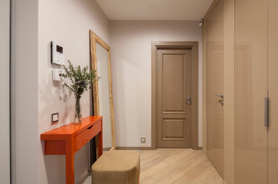 В отличие от частных домов, в квартирах коридоры маленькие, и хочется сделать их визуально больше. Для увеличения пространства используются светлые оттенки стен, пола, мебели.