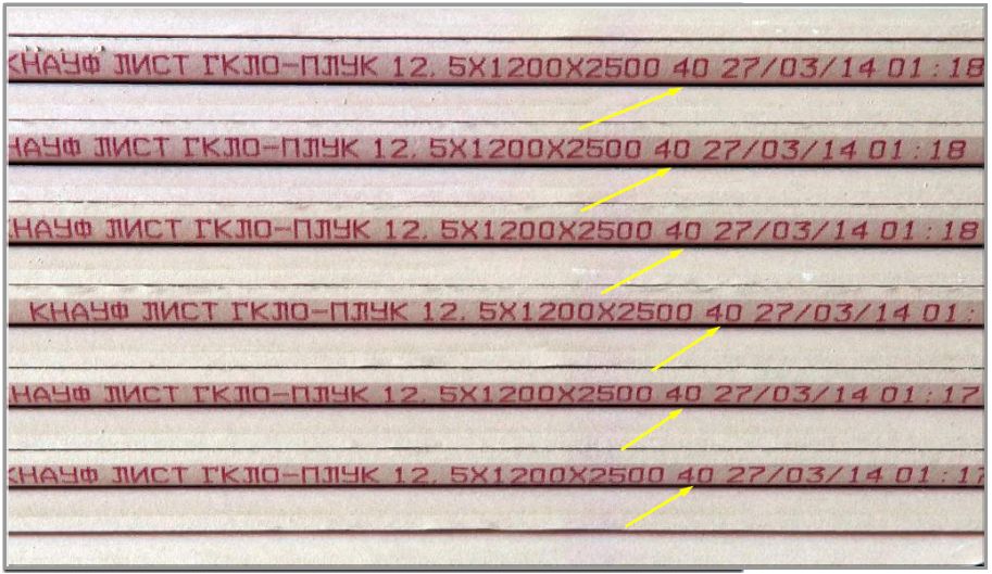 - Маркировка. Обозначения обязательно должны включать производителя, название – ГКЛО, вид кромки, габариты, временные показатели устойчивости к огню, а также норматив, согласно которому выполнялось изготовление.