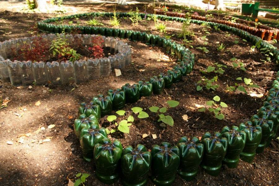 Наверняка у каждого садовода имеется множество пустых пластиковых контейнеров или бутылок, которым тоже можно найти применение. Нет ничего проще, чем сделать оригинальные садовые ограждения из использованной пластиковой тары.