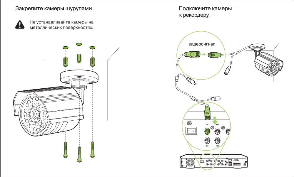 Обратите внимание, что камеры нельзя крепить на металлические основания, а линии кабеля прокладывать вблизи уже имеющихся силовых. Установите камеры на максимальной высоте, зафиксировав их шурупами