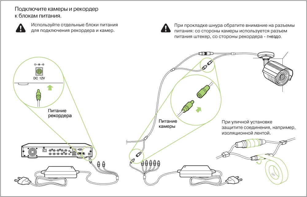 Обязательно используйте два блока питания: один – для камер, второй – для видеорегистратора. Соединительные шнуры спрячьте в металлические гофры. Если есть возможность – проведите скрытую прокладку кабеля. При уличном монтаже соединения необходимо защитить от влаги, обмотав их изоляционной лентой или спрятав их в распаячную коробку.