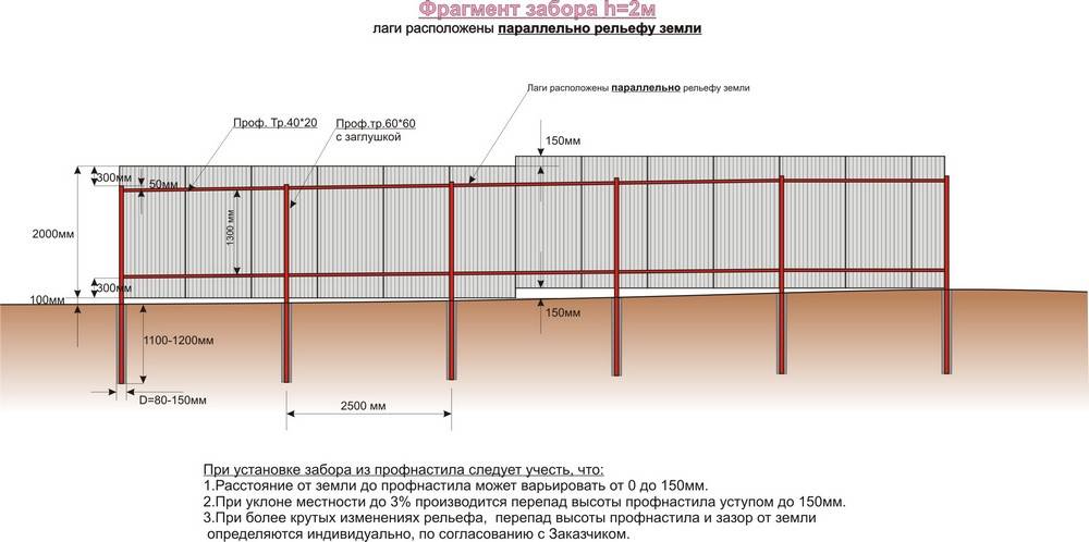 Именно столько профлиста необходимо, чтобы полностью закрыть весь периметр. Высота листа составляет 2 м. Высота самого профиля (гребня) — 0,7 мм. Крепить их лучше всего на профильную трубу 4×6 мм, которая имеет толщину стен 2 мм. Трубы устанавливаются на расстоянии 2 метра друг от друга. Для каждой из них выкапывается ямка глубиной 30-40 см. Труба вставляется в ямку, вокруг нее заливается бетон. Та ее плоскость, которая имеет 6 мм, должна фиксироваться параллельно линии периметра. Используются трубы в качестве опорных столбов. Их высота должна совпадать с высотой профнастила.