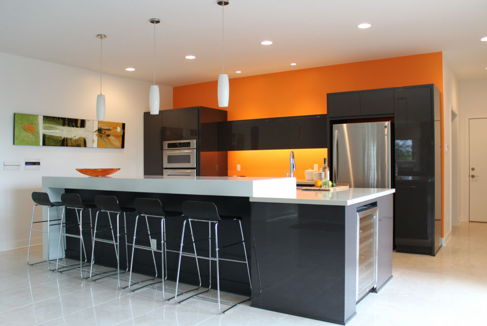Некоторым нравится оранжевый кухонный гарнитур. При наличии такой мебели стены должны быть нейтральными, чтобы не сливаться в яркое пятно с мебелью. Лучше обратиться к ахроматической гамме: черный, белый, серый. Дизайн кухни с оранжевым гарнитуром – выбор современных активных людей. По стилистике он больше относится к модерну, хай-теку, минимализму, а также авангардным направлениям – фьюжн и китч.
