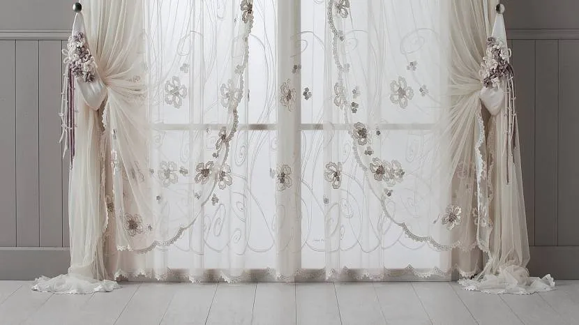 Ткань можно украсить своей вышивкой (машинной или ручной). Или же купить готовую вышитую модель. Белые шторы из органзы с мелким цветочным рисунком будут красиво смотреться с кружевными или домоткаными подхватами. К тканям с радужными переливами оттенков подходят ламбрекены, задрапированные по всей длине оконного карниза. Материал ламбрекенов подбирают тоже из органзы, другой легкой или плотной ткани.