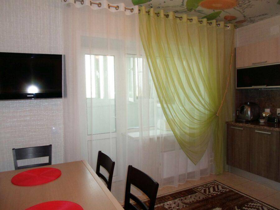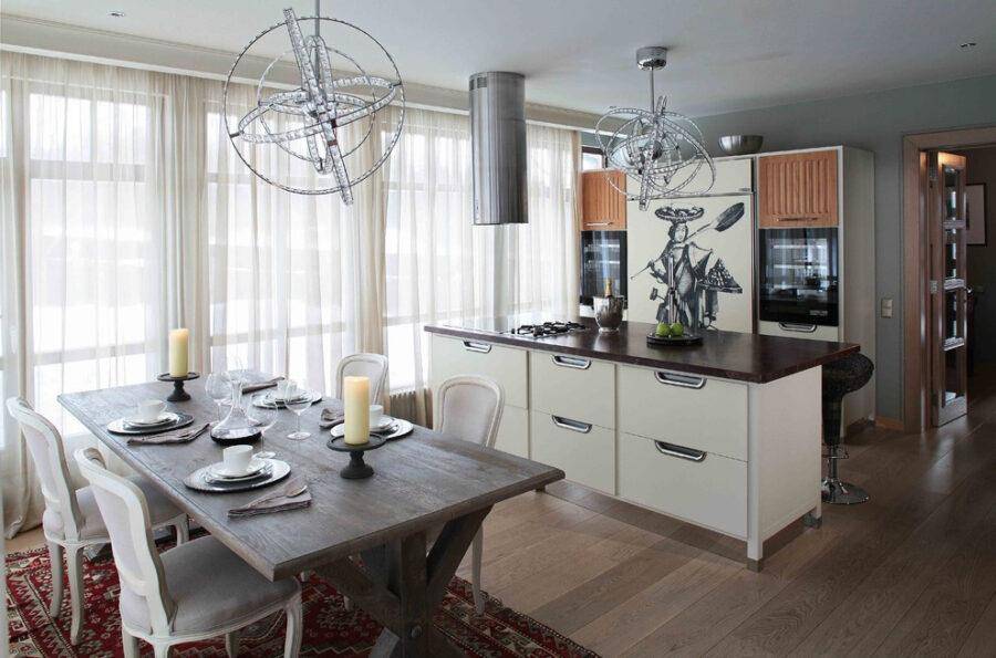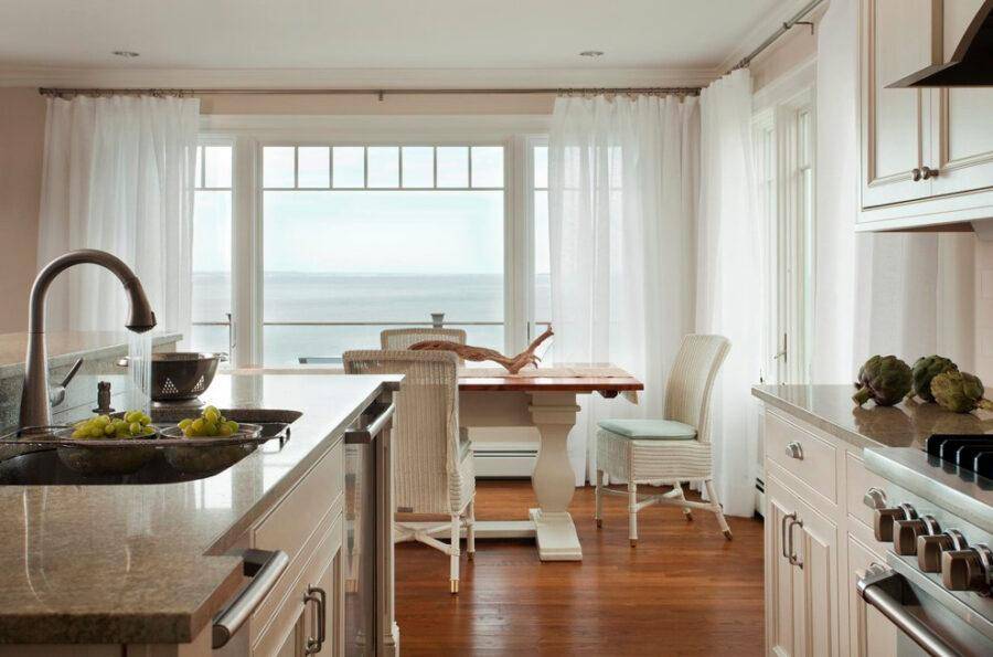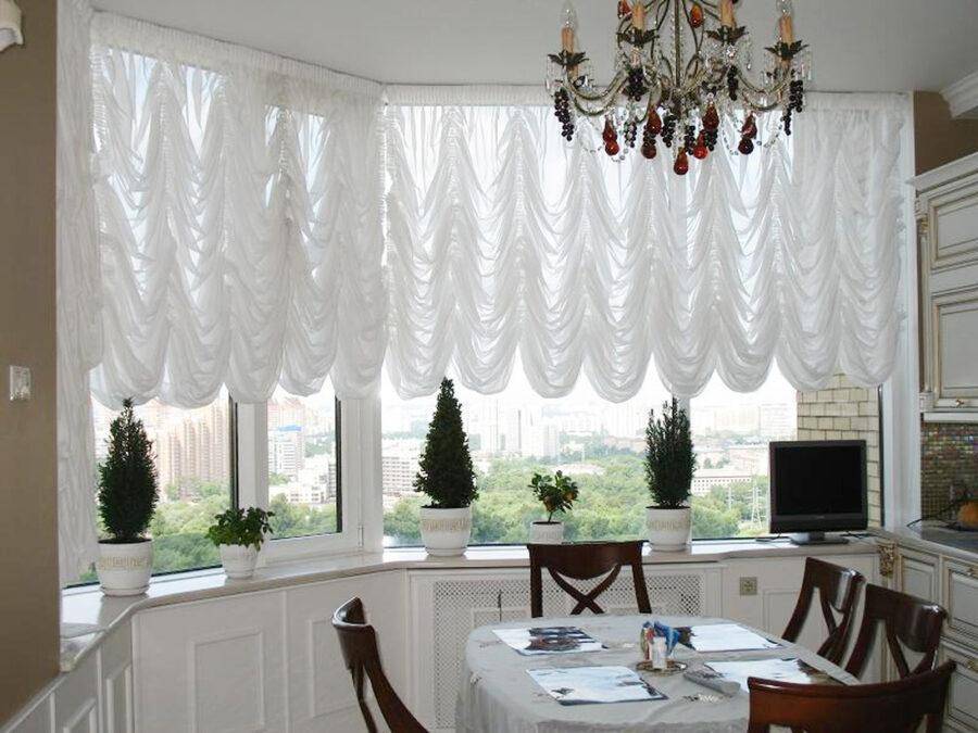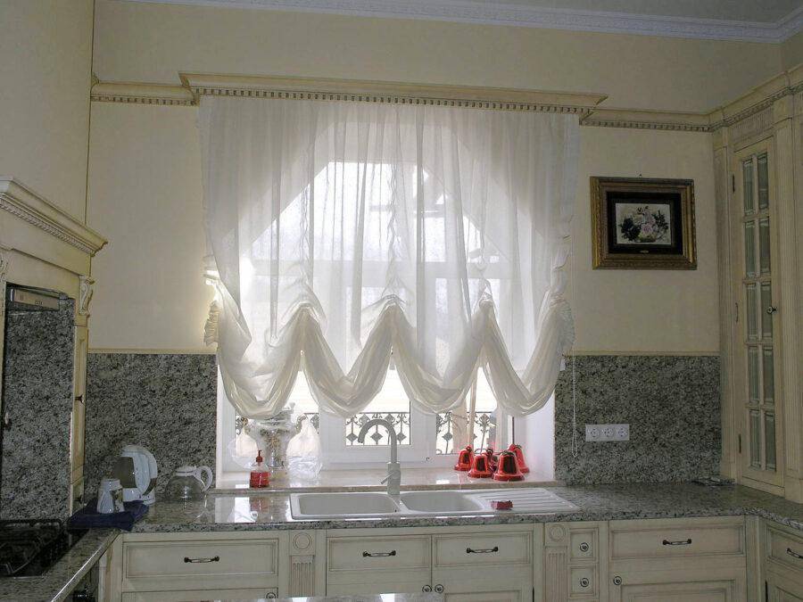 В просторную кухню дизайнеры рекомендуют вешать на оконные проемы одновременно несколько видов тюля