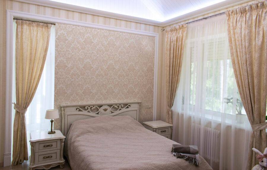В небольших спальнях хорошо будут смотреться портьеры с прозрачной серединой, выполненной из плотно набранной тюли. Такое оформление окна создаст визуальный эффект расширения помещения и в то же время скроет от посторонних глаз.