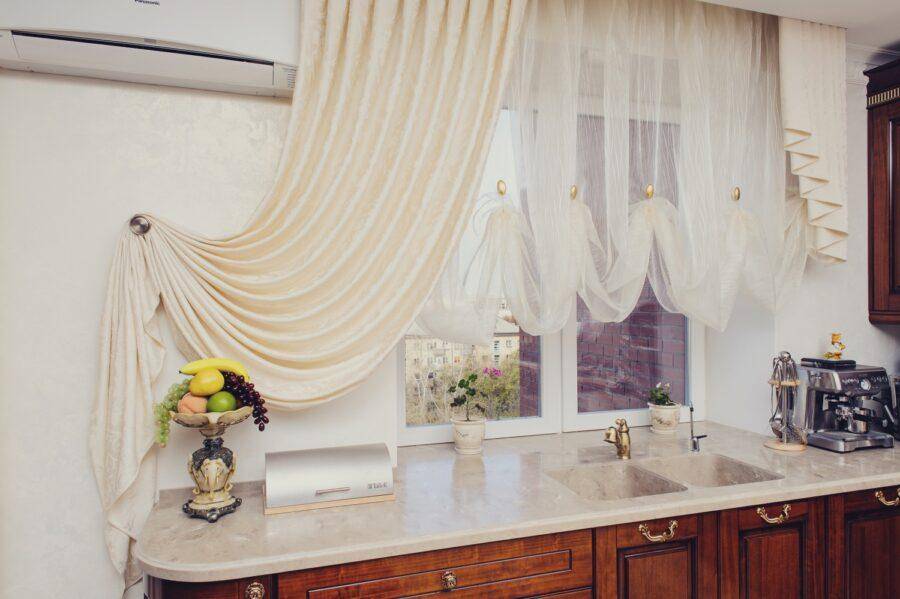 Если шторы для гостиной должны быть впечатляющими, то на кухне более важен показатель выносливости, стойкости к запахам, воде и загрязнениям.