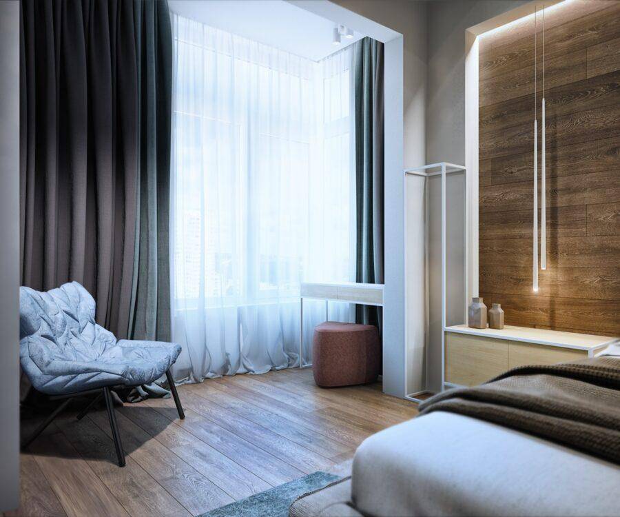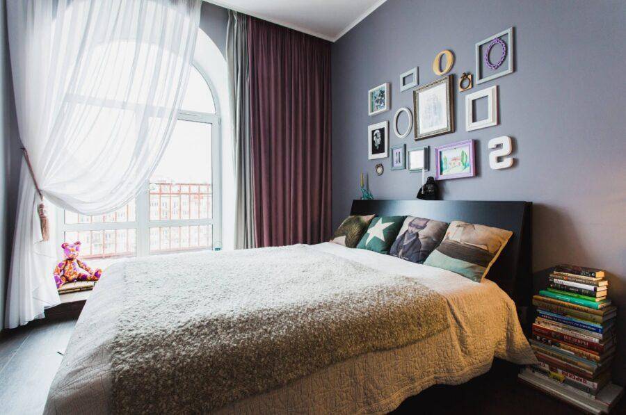 В интерьере этой спальни дизайнер отказался от использования портьер в пользу уплотненных льняных гардин из вуали. Они одновременно защищают комнату и от света, и от взглядов с улицы, а также позволяют создать ощущение безопасности и уюта в комнате. Глубокий серый цвет повторен и в обстановке (покрывало), отчего он смотрится гармонично и уместно.