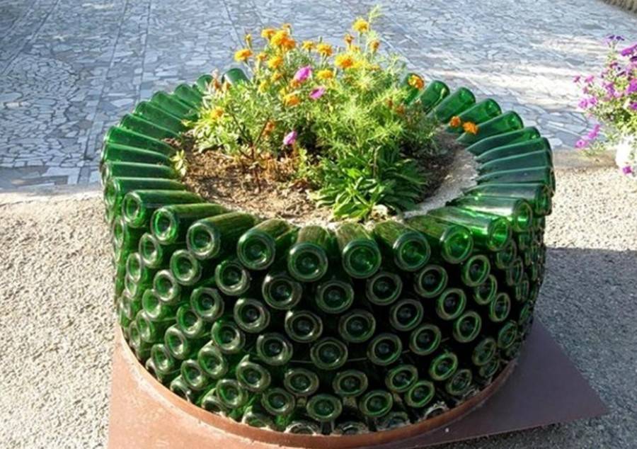 Оригинальное решение для дачного участка – это клумба из стеклянных бутылок, расположенных в несколько ярусов. Стеклянная тара не только ограничит каждый ярус, но и станет прекрасным декоративным дополнением к цветнику. Схема пошаговой работы: