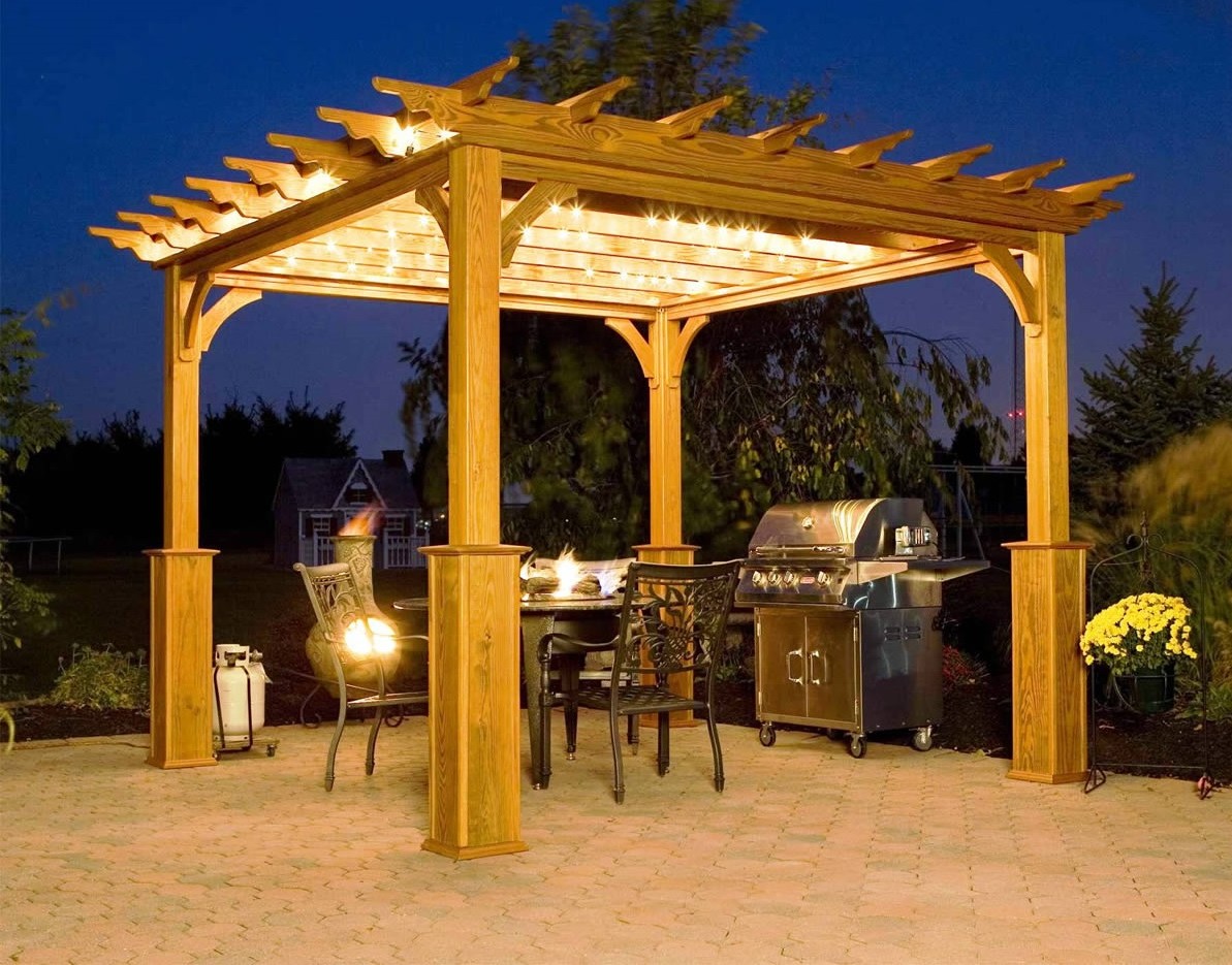 Основное освещение беседки поможет оптимально отрыть пространство конструкции в вечернее время, в тоже время, способствовать созданию романтичной атмосферы, подчёркивая прелесть теплого летнего вечера.