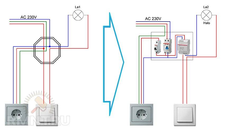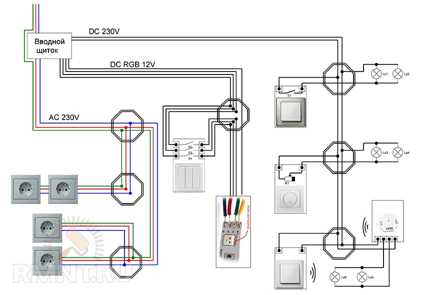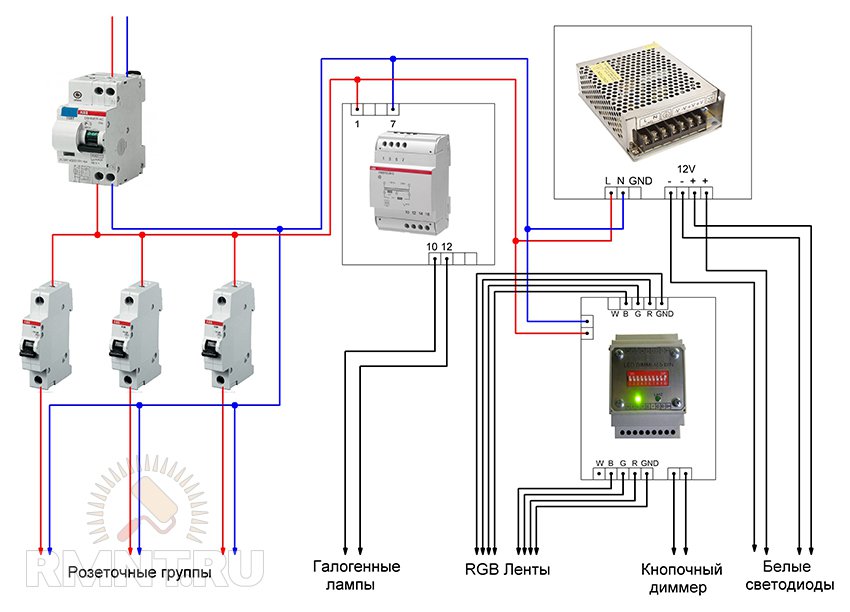 Что касается схемы подключения и разводки такой осветительной сети, вы, скорее всего, не встретите трудностей. Трансформатор подключается к сетевому напряжению, дальнейшая разводка выполняется независимо от системы. Коммутация освещения выполняется обычными выключателями, для галогенных ламп полярность не имеет значения. А вот в случае с LED лампами, особенно работающими в режиме RGB, придется сохранять полярность и ставить в разрыв только положительный провод.