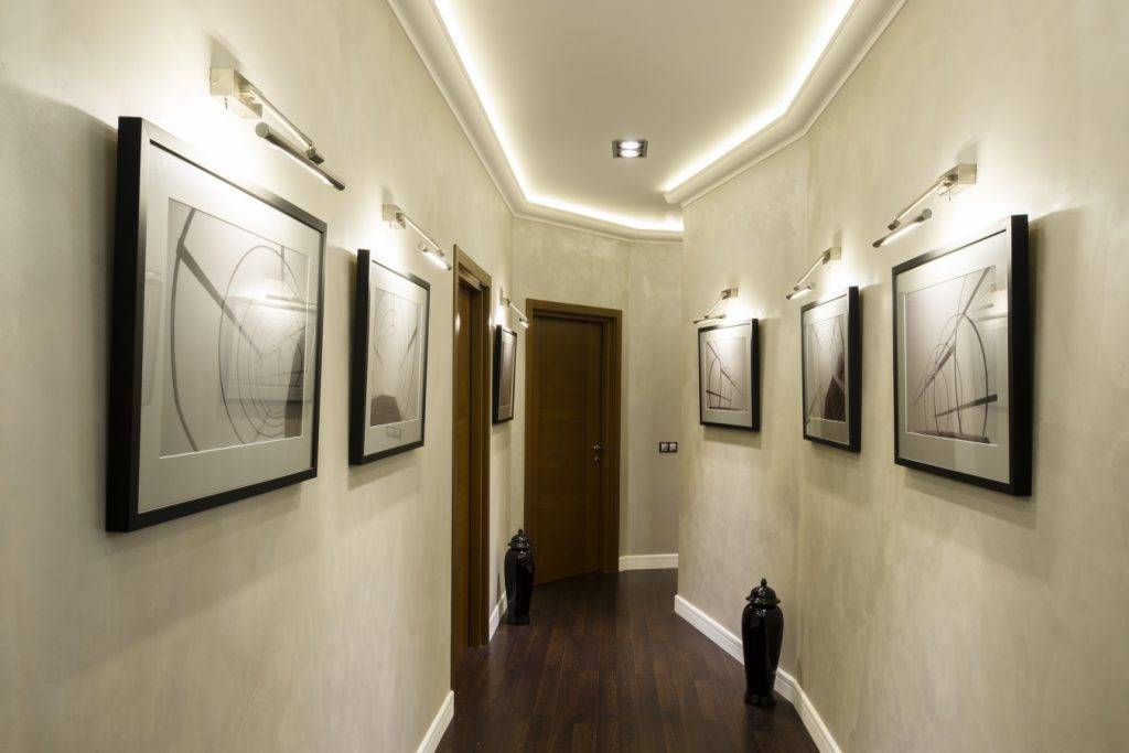 В узком коридоре рекомендовано устанавливать несколько осветительных приборов. При этом свет должен быть направлен на противоположную сторону. Светильники, расположенные наверху, должны светить на стены. Это позволит зрительно сделать коридор шире.