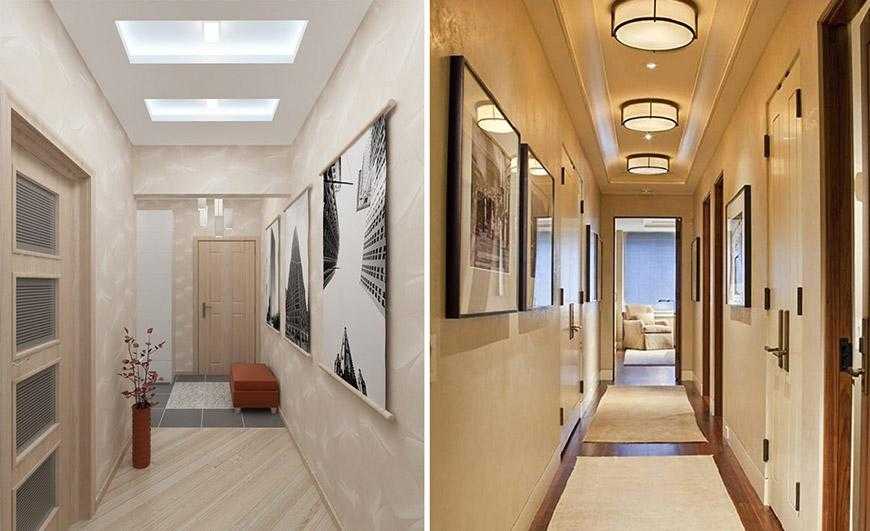 Использование двух зон в таких коридорах является одной из основных характеристик. Этого можно добиться, применив к каждой зоне освещение в одном стиле или разное.