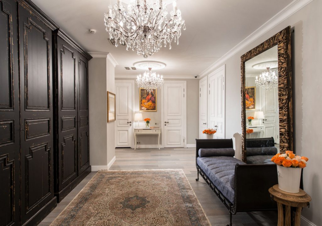 Меньшая часть коридора, идущая параллельно вытянутому коридору, часто получает освещение из основных помещений. Поэтому там достаточно нескольких настенных светильников. В основной зоне следует установить трековое освещение, точечные светильники и/или 2-3 миниатюрные люстры.