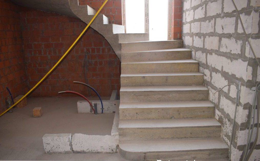 Бетонные лестничные марши все чаще делают с забежными ступенями там, где планировка и размеры помещения не дают возможности обустроить прямой марш и поворот спасает положение, экономя полезное пространство.