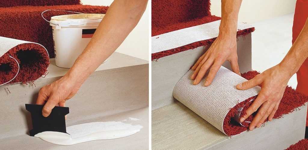 В первую очередь производим обмер ступеней и раскраиваем полотно, после чего обрабатываем поверхность лестницы грунтовочным составом (для бетона). После высыхания грунтовки наносим клеевую массу и разравнимаем ее по всей площади ступеней. Остается лишь уложить куски ковролина и плотно прижать их на время.