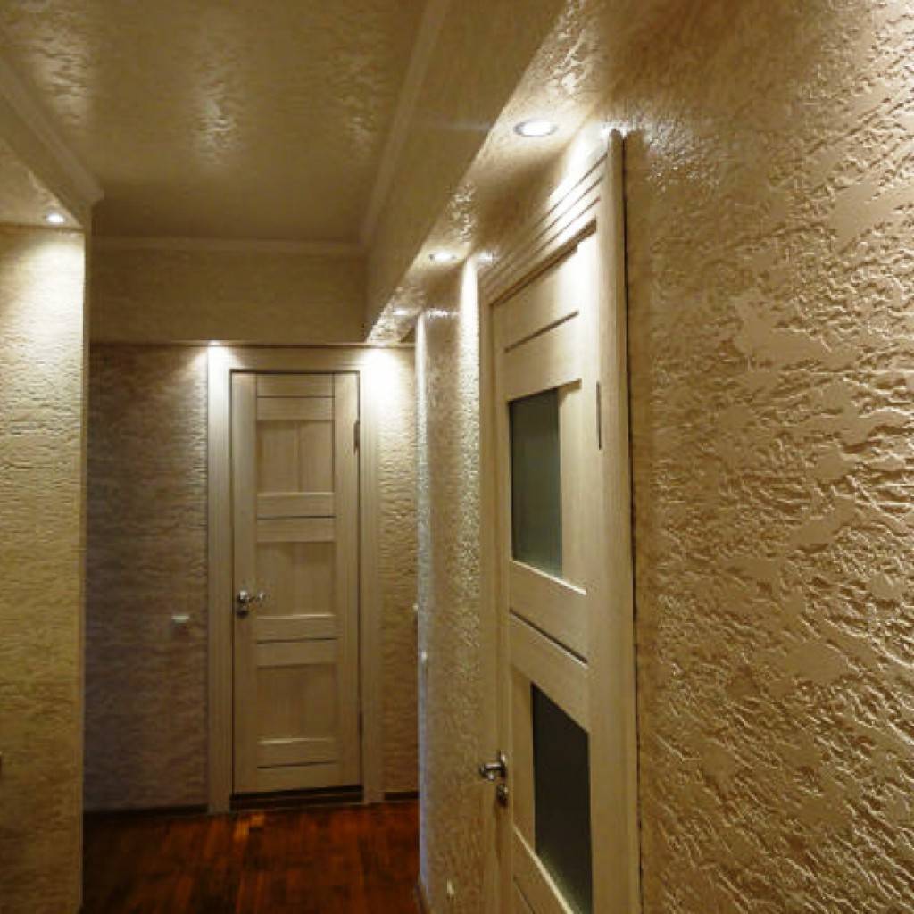 Шикарный интерьер подчеркнут грамотно разработанным освещением, обои в коридоре имитируют декоративную штукатурку