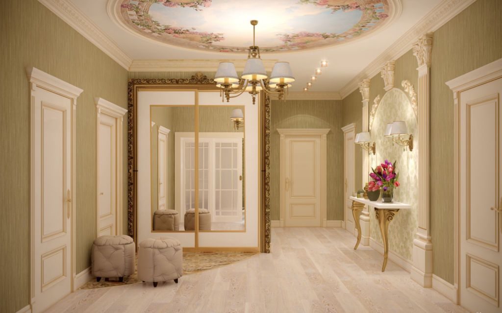 - Классика. Здесь будут уместны дорогие отделочные материалы в спокойной и благородной цветовой гамме. Декор в виде роскошных картин, зеркал, лепнины, скульптурных элементов, фресок или панно станет выгодным дополнением классического стиля.
