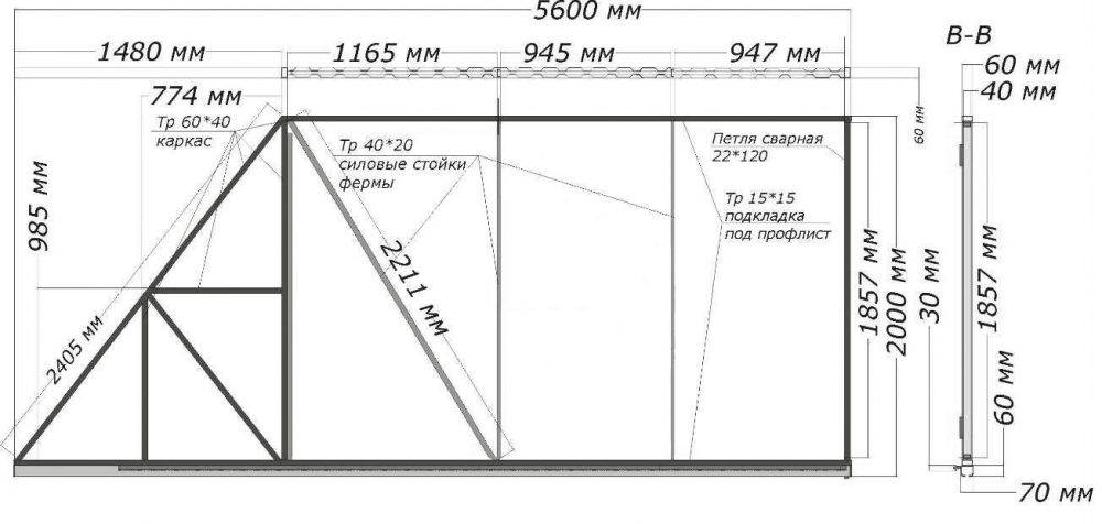 Для изготовления внешней рамы ворот используется профильная труба 60х40х2 мм, обрешетка изготавливается из трубы 20х20х1,5 мм. Чертеж рамы ворот для проема шириной 3 метра приведен ниже: