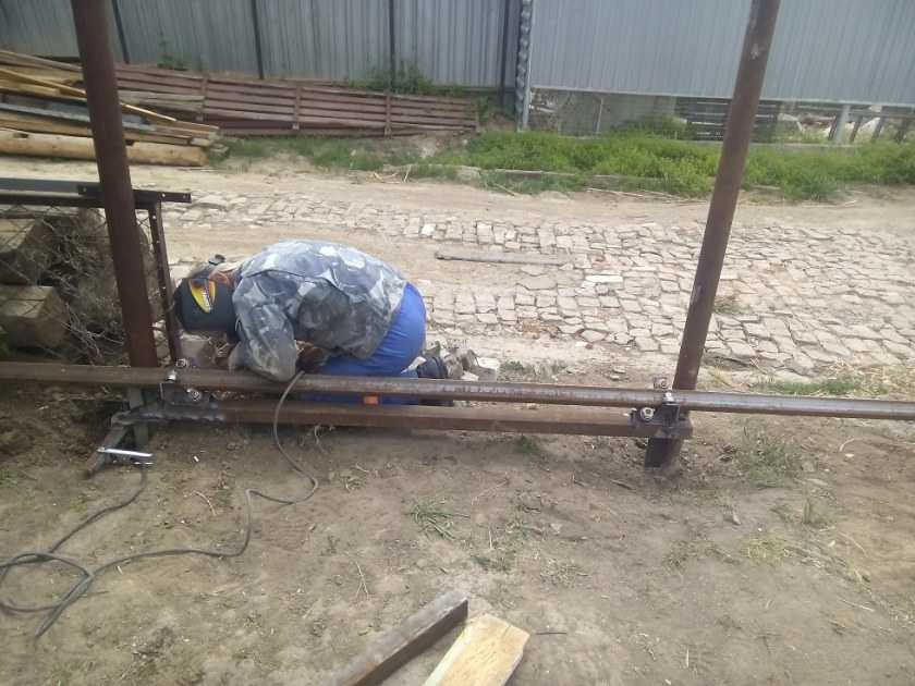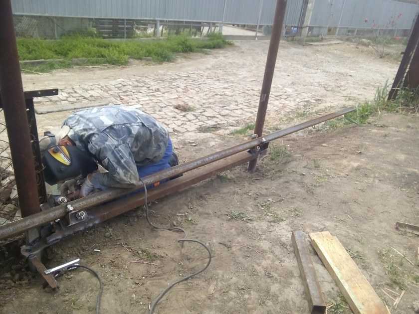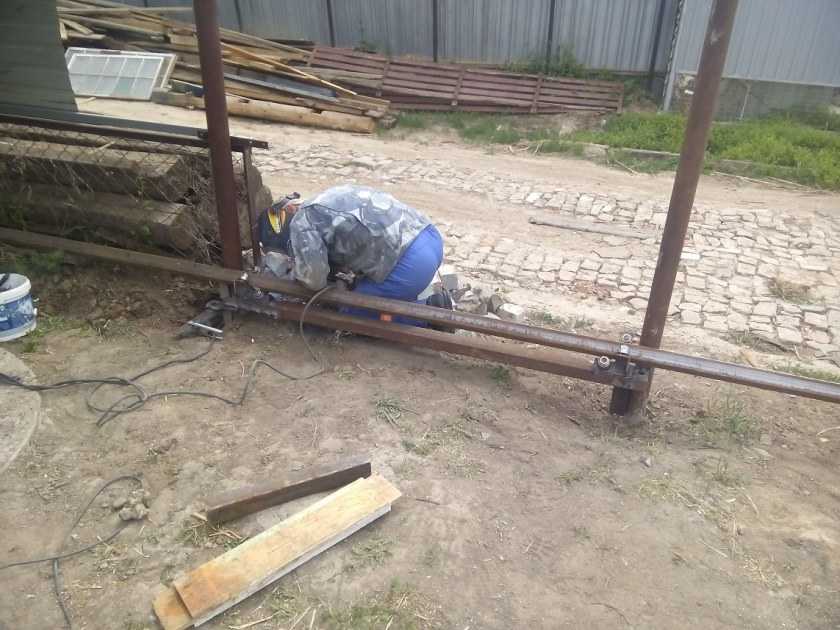Все начинается с обустройства фундамента, на который и будет приходиться большая часть нагрузки. В верхней части конструкции крепят опоры – по ним движется направляющая балка, она же и приваривается к створкам.