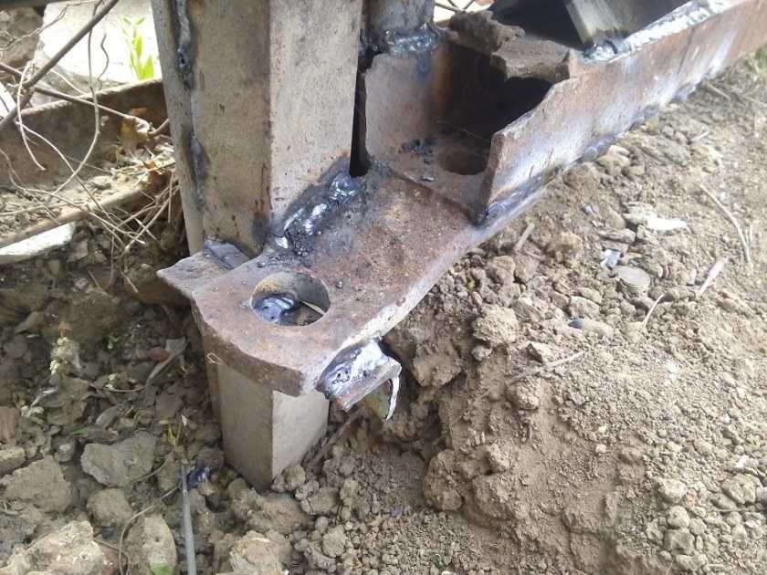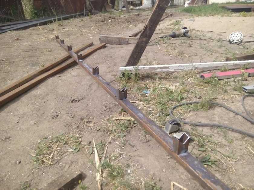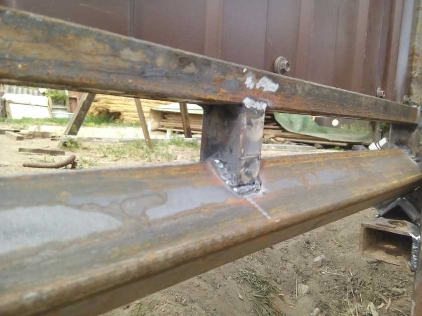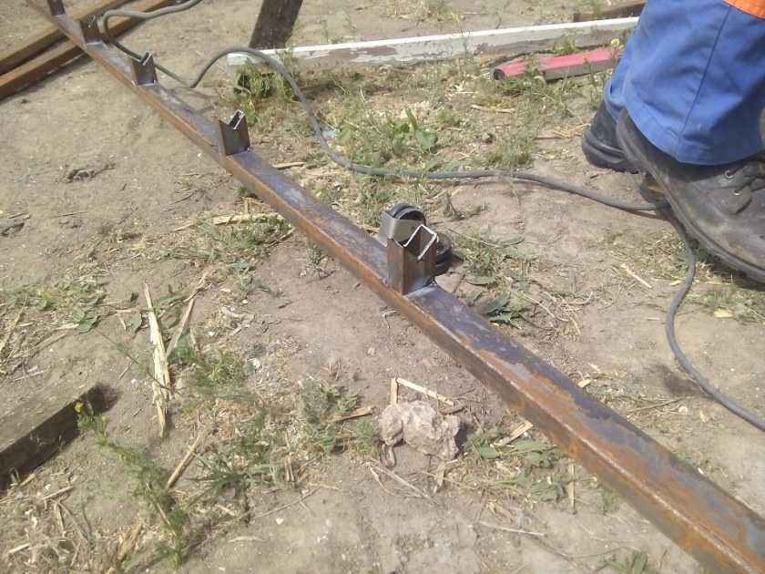 Сборка стартует с направляющего рельса. Элемент заранее готовят: укрепляют с помощью приваривания по бокам «подставки» из квадратных труб. Аналогично, но не прямым швом присоединяют нижнюю границу несущего каркаса. Здесь лучше использовать шахматную схему фиксации.