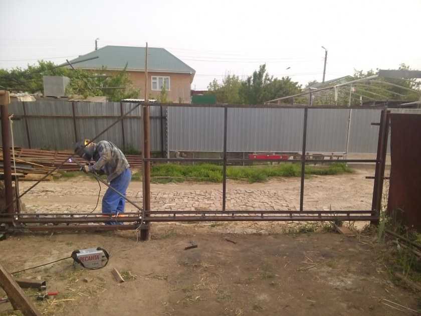 Торцы профильных труб обрезаются под прямым углом или углом в 45°. Стойки и горизонтальные перемычки собираются воедино на плоской поверхности. Угольником проверяется, насколько правильно собраны створки (более точно качество сборки проверяется рулеткой, которой измеряются диагонали конструкции). Вертикальные и горизонтальные элементы каркаса окончательно свариваются. Вырезаются укосины и также привариваются к рамам. Установка створок и калитки ведется только через 2 недели после заливки котлованов под опорами бетоном.