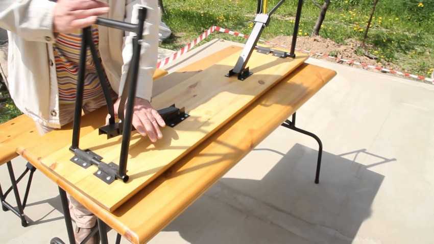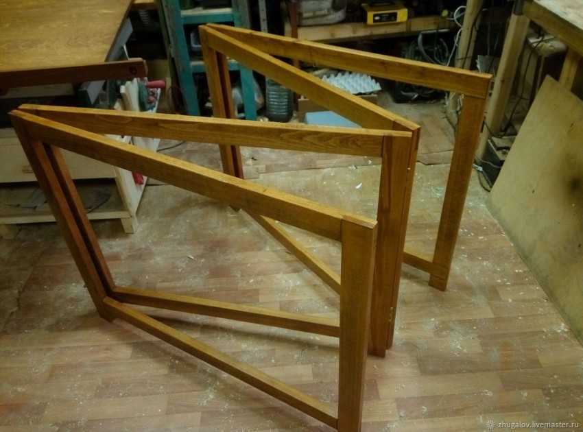 Далее по длинным краям столешницы крепятся опоры, к которым будут стыковаться ножки. Расстояние между ними должно соответствовать ширине одной из пары ножек. Крепятся они также, с помощью подвижного болтового соединения.