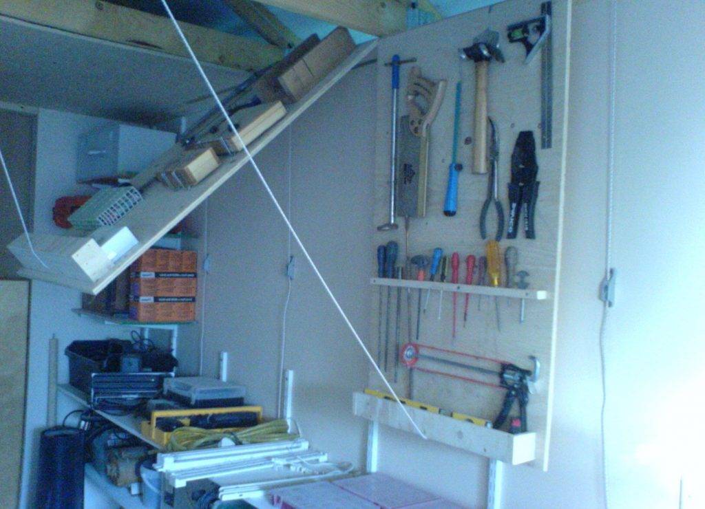 Когда в гараже стоит машина место для работы очень мало. Стоит что-то поставить и места нет вообще.Было принято решение установить компактный стол, но стол мешает все равно. Идеальным вариантом стал откидной стол. Места занимает минимум.
