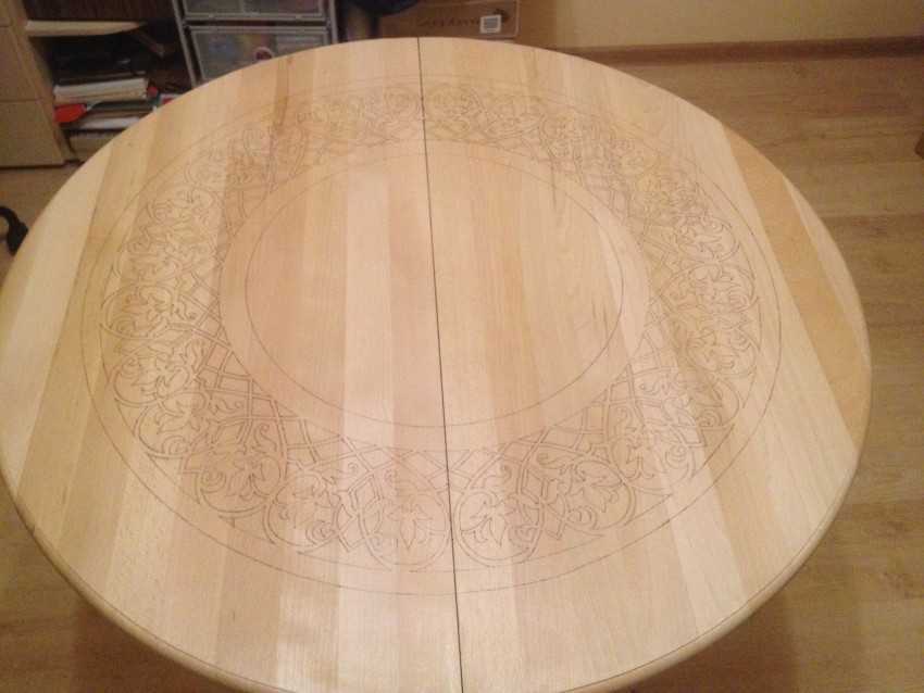 За основу мастер использует одну из боковин деревянной катушки. Боковину необходимо распилить пополам на две части, которые нужно склеить вместе — таким образом мы увеличиваем толщину столешницы.