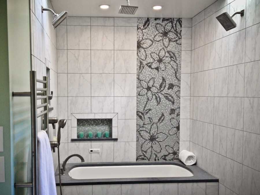 Размер панно из плитки в ванной напрямую зависит от площади ванной комнаты. Его дизайн может скорректировать недостатки помещения и значительно улучшить внешний вид ванной.