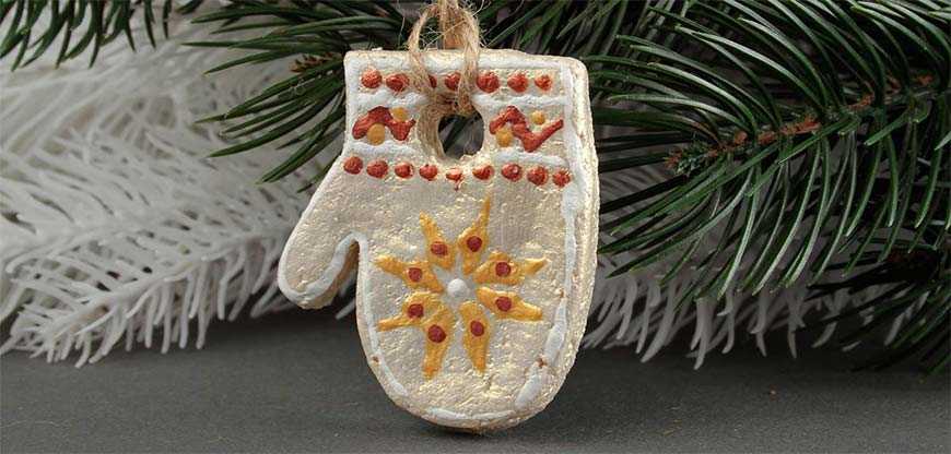 После просушивания проденьте в игрушки ленты. Декорируйте украшения бусами, пуговичками, стразами или блёсточками.