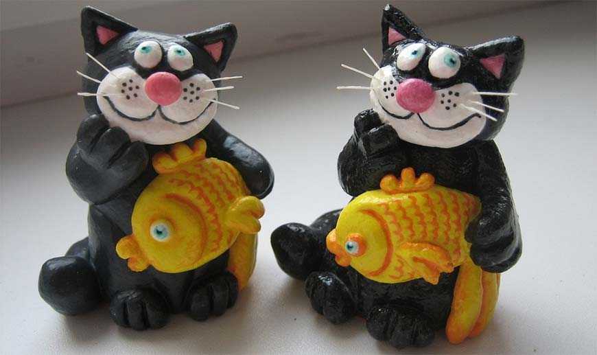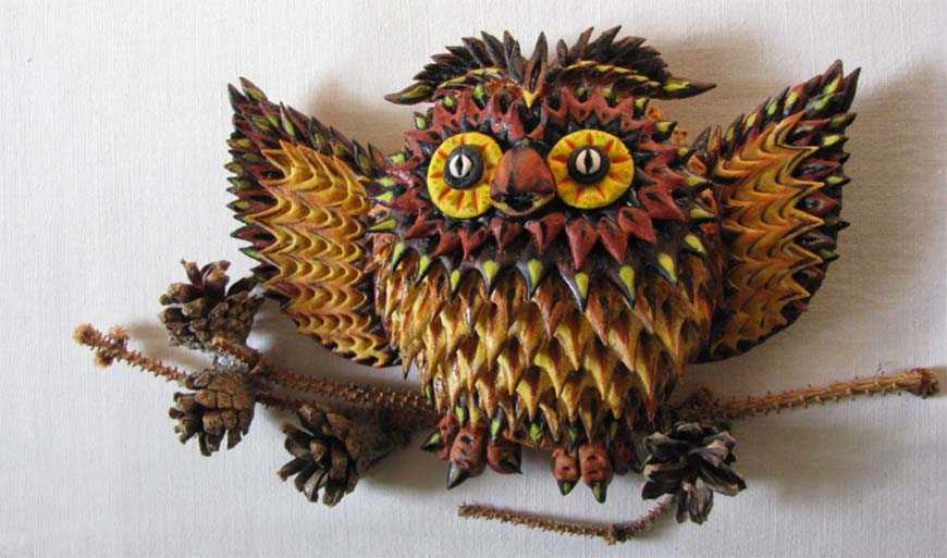 Возьмите ложку и отделите ней две части теста. Это будет туловище и голова совы. Сделайте из этих кусочков фигурки необходимой формы и скрепите их. Отдельно возьмите полоску теста и сделайте на ней небольшие надрезы – это будет воротник. Положите его на туловище и ножом прорисуйте крылышки. Оставшиеся маленькие куски теста используйте для изготовления глазок и клювика. Готовую фигурку просушите и покрасьте по своему вкусу.