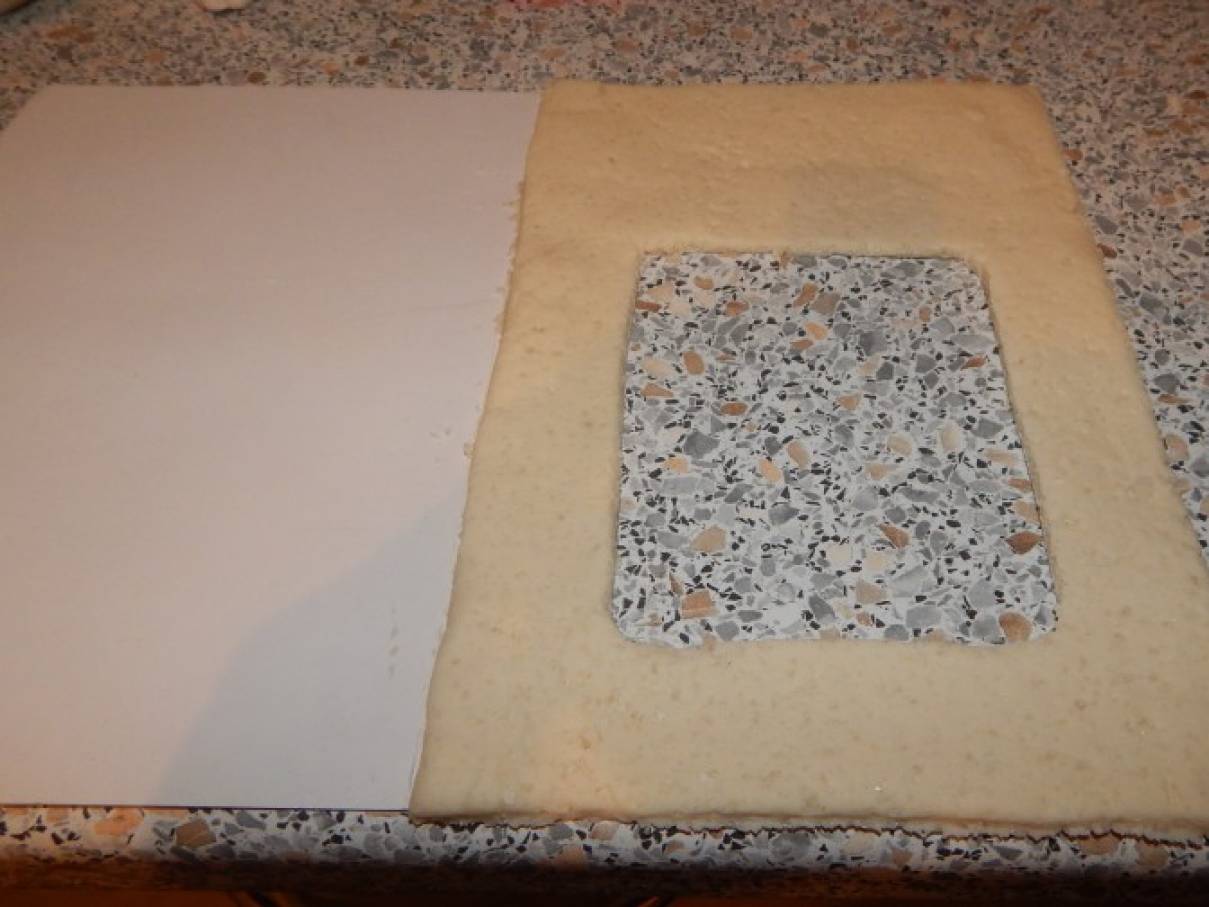 Рамку из теста накладываем аккуратно на картон. Следим, чтобы не выходила за контур, лишне отрезаем.