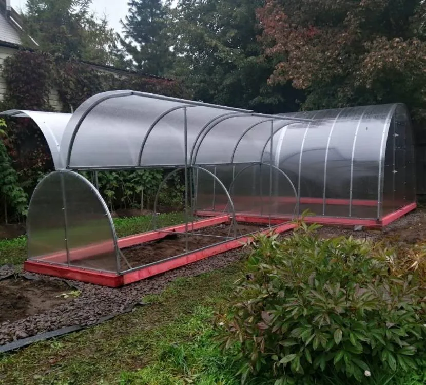 В качестве материала для изготовления каркаса используют профильные металлические или полые полиэтиленовые трубы, в роли укрывного материала — поликарбонат или пленку. В случае износа или механического повреждения покрытия, легко можно заменить его полностью или частично.