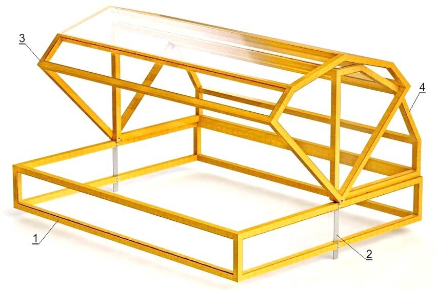 Конструкция хлебницы состоит из прямоугольного основания. На противоположных торцах парника сделаны треугольники, выступающие опорой створок. Здесь же происходит их крепление шарнирами. Сами створки парника собраны из полудуг. Между собой они соединены перемычками. Одна створка хлебницы делается меньшего размера. Диаметр полудуг примерно различается на толщину поликарбоната. Разница в размерах позволяет створкам парника независимо открываться, сдвигаясь друг за друга.