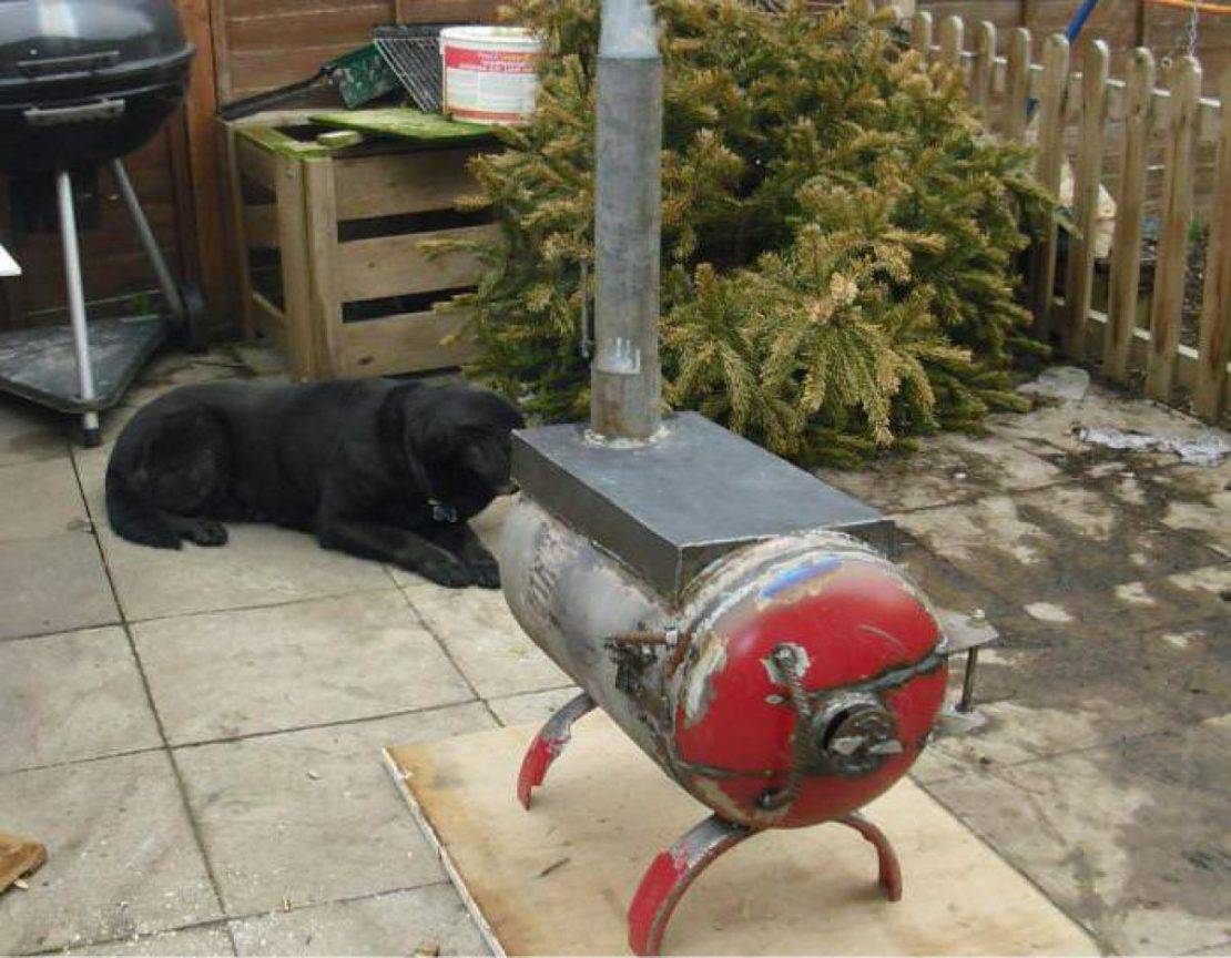 - на этом же баллоне разметить ещё один проём и приварить к нему изготовленную топку, а вертикальную трубу к лежаку;