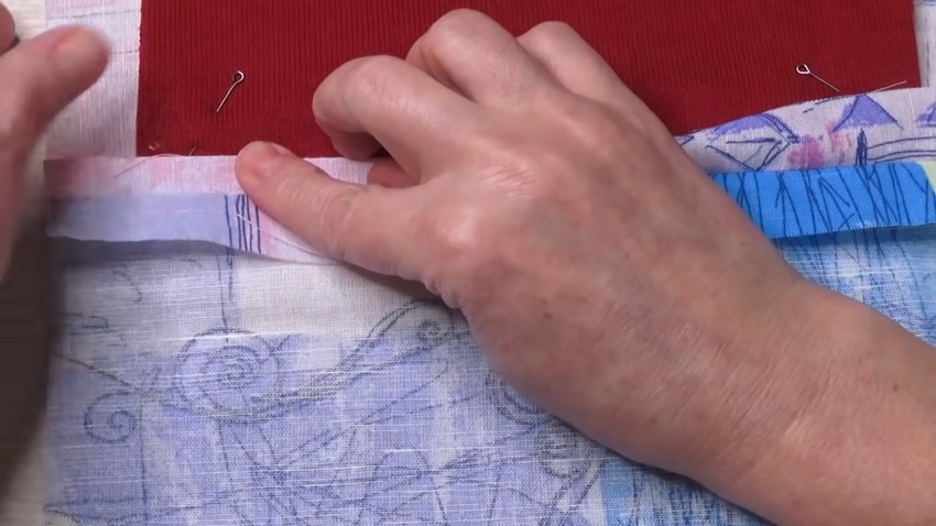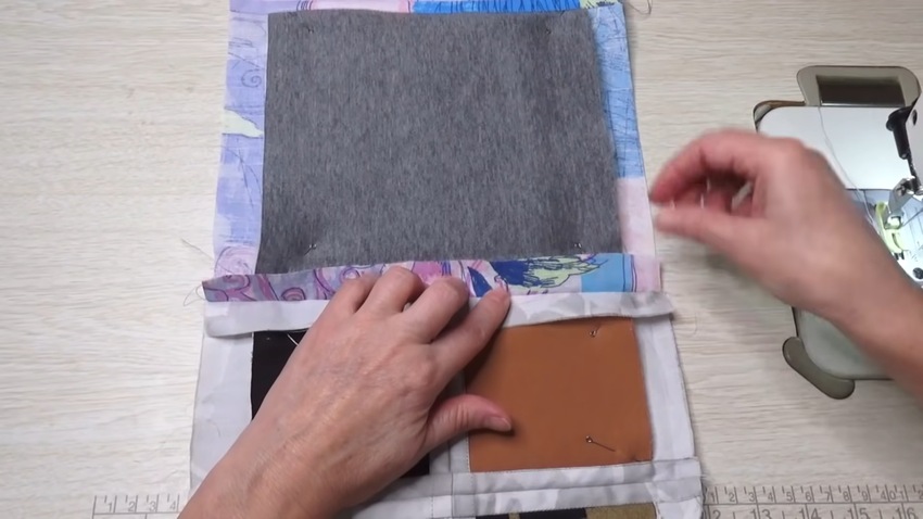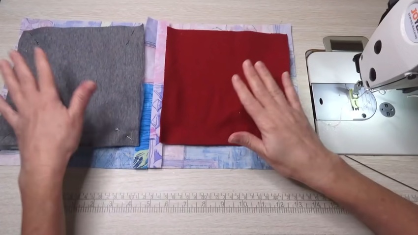 | 4 | ![]() | После этого можете приступать к сбору рядов: наложите одну подложку на другую лицевой стороной и прострочите 1 край с отступом 2 см. Затем распрямите ткань, пригладьте шов и разложите квадраты меньшей формы на изнаночную сторону заготовки утеплителем вниз. Зафиксируйте материал со всех сторон. |