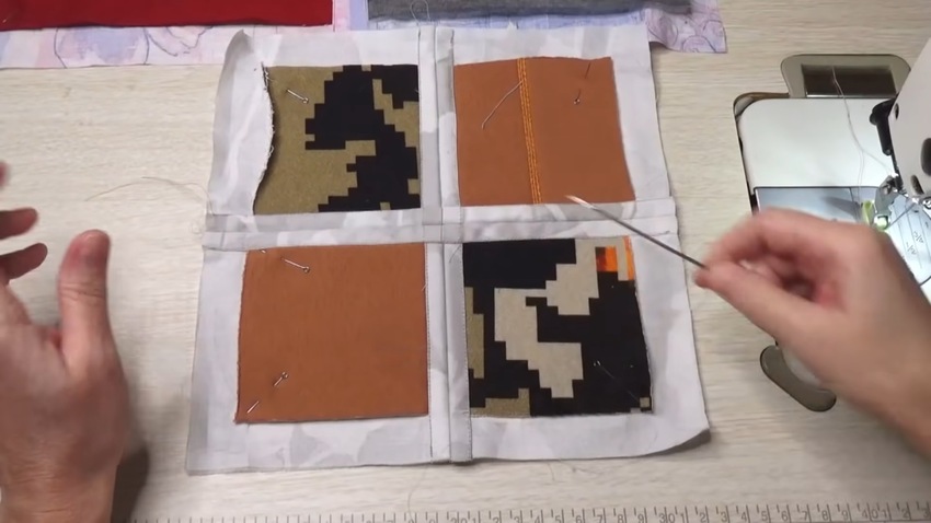 Вырежьте из ткани пару длинных и пару коротких прямоугольников. Возьмите еще одну ткань – и подготовьте небольшой квадратик. Прямоугольники сшиваются вокруг него для образования большого квадратного фрагмента.