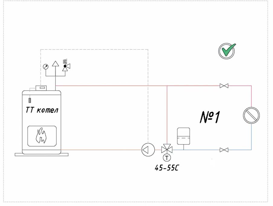 Недостаток схемы в том, что в систему может подаваться теплоноситель температурой не менее 55 градусов. Для осени или весны эта температура уже является некомфортной, и понизить ее никак не возможно, так как используется трехходовой термостатический клапан. При 45 градусах ваш котел будет просто стоять в режиме ожидания и топливо просто будет расходоваться впустую. Кроме того, дрова в режиме тления опять-таки способствуют образованию смол на стенках котла и снижению его КПД.